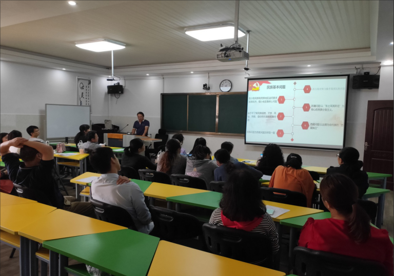 2019年10月16日,人文与管理学院在人文楼208社工实验室开展“民族宗教”主题学习会,由学院党委副书记阳荣华主讲,学院全体教职工参会。