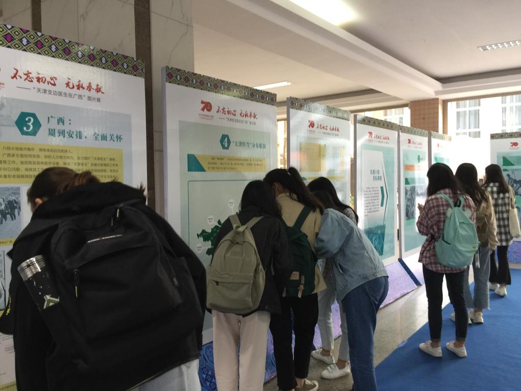该图片巡展在学校东城校区展出,记录了上世纪六七十年代,为响应国家号召,有这么一群人,他们怀揣着使命,肩负着重担,心中始终坚定地朝着一个目标走去……他们,就是“天津支边医生”!数年来,他们投身于广西医疗援助事业的身影,无法让人忘怀。如今50年过去,当年他们扎根在这八桂大地、奋力援助广西医疗事业的感人瞬间被定格成一张张图片,再度唤起人们对那段激情燃烧岁月的回忆。
