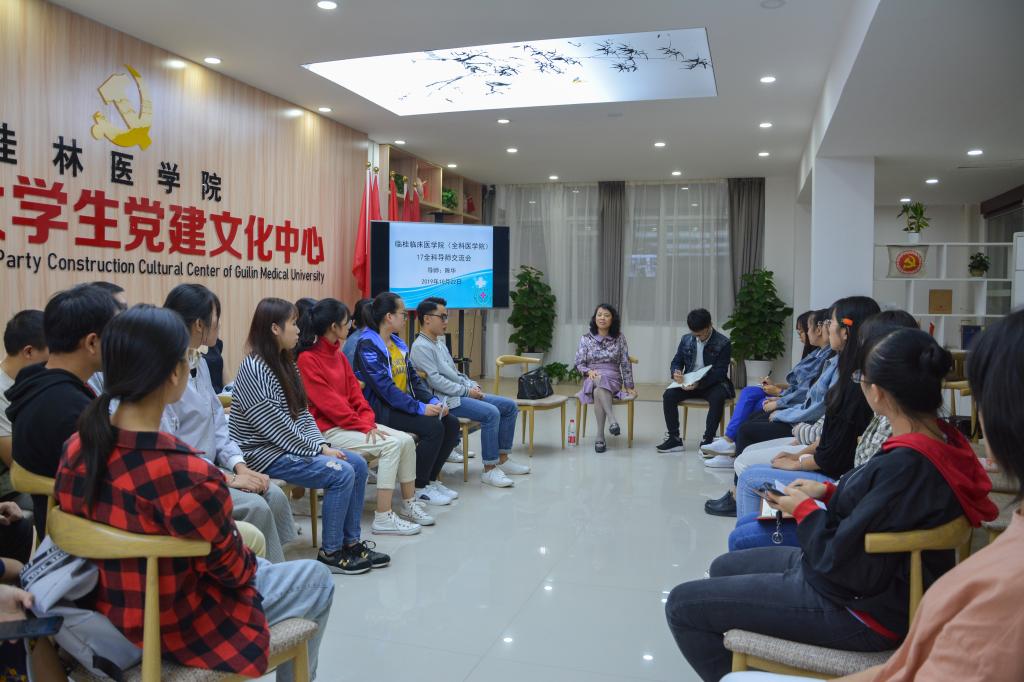 为贯彻“三全育人”工作精神,进一步推进大学生导师制度,强化全科医学生职业规划意识,2019年10月22日,临桂临床医学院(全科医学院)在临桂校区大学生党建文化中心召开17全科医学班导师交流会。2017级全科班部分学生代表及桂林医学院第二附属医院全科医学科主任、大学生导师陈华教授出席本次交流会。