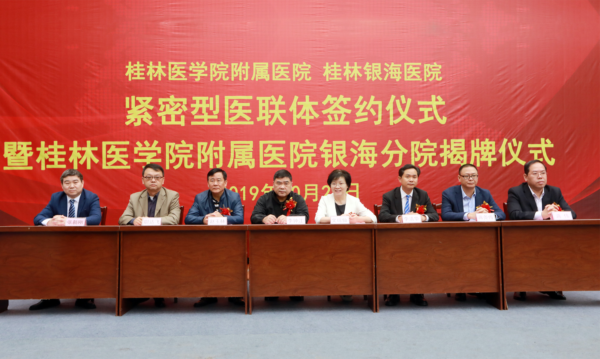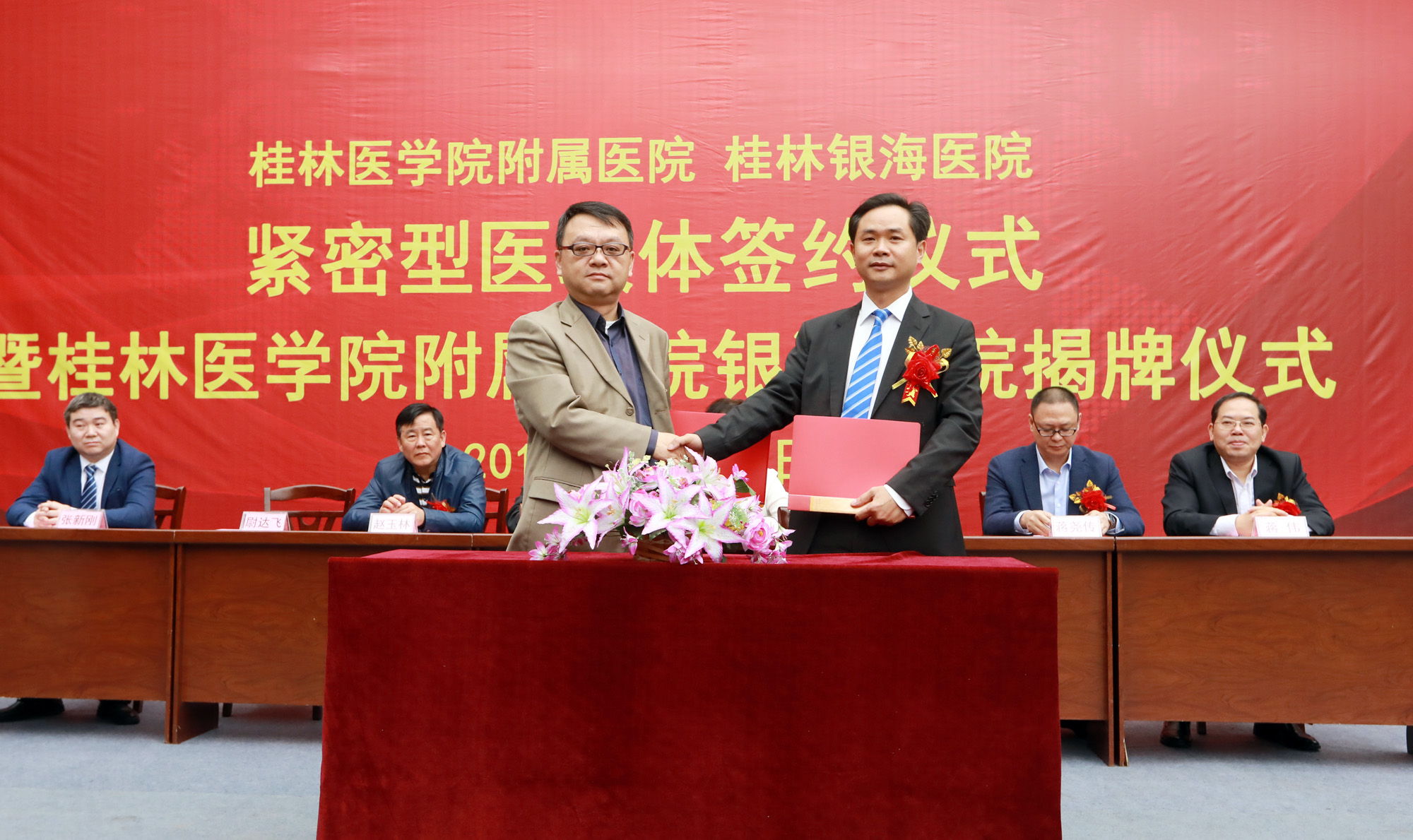 10月25日上午,桂林医学院附属医院与桂林银海医院结成紧密型医联体,于当天正式签约,并揭牌成立“桂林医学院附属医院银海分院”。这是桂林首家由公立医院与民营医院结成的紧密型医联体。