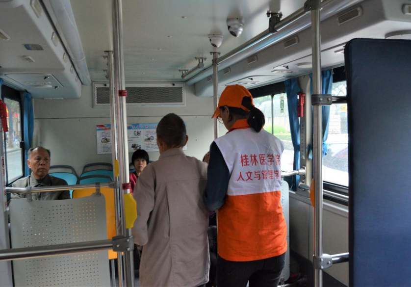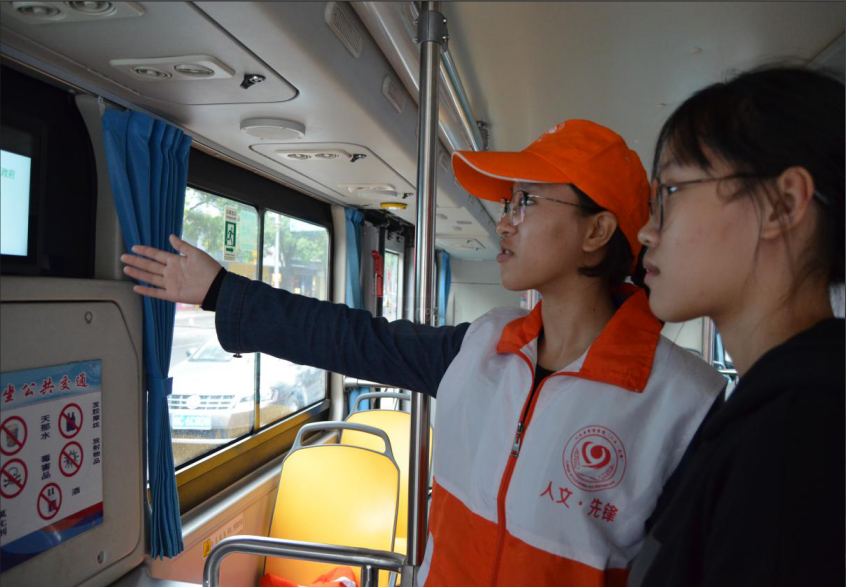 活动当天将志愿者分为2或3人一组,志愿者在车厢内分发宣传材料,向市民们宣传文明乘车意识,引导上下车的乘客有序乘车、维护公交车内秩序,主动帮扶老、弱、病、残、孕等上下车,保障出行安全。在“情暖公交,为民服务”的服务活动中,有一位老人吃力地提着一个大包裹准备上车,志愿者见状,赶紧大步走向前,一把接住老人的包裹,慢慢搀扶老人到座位上坐下,并叮嘱老人下车不要急,等车停稳了,在站台的志愿者也会提供必要的帮助。