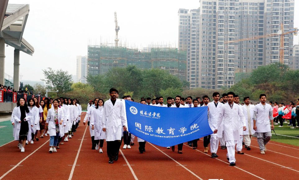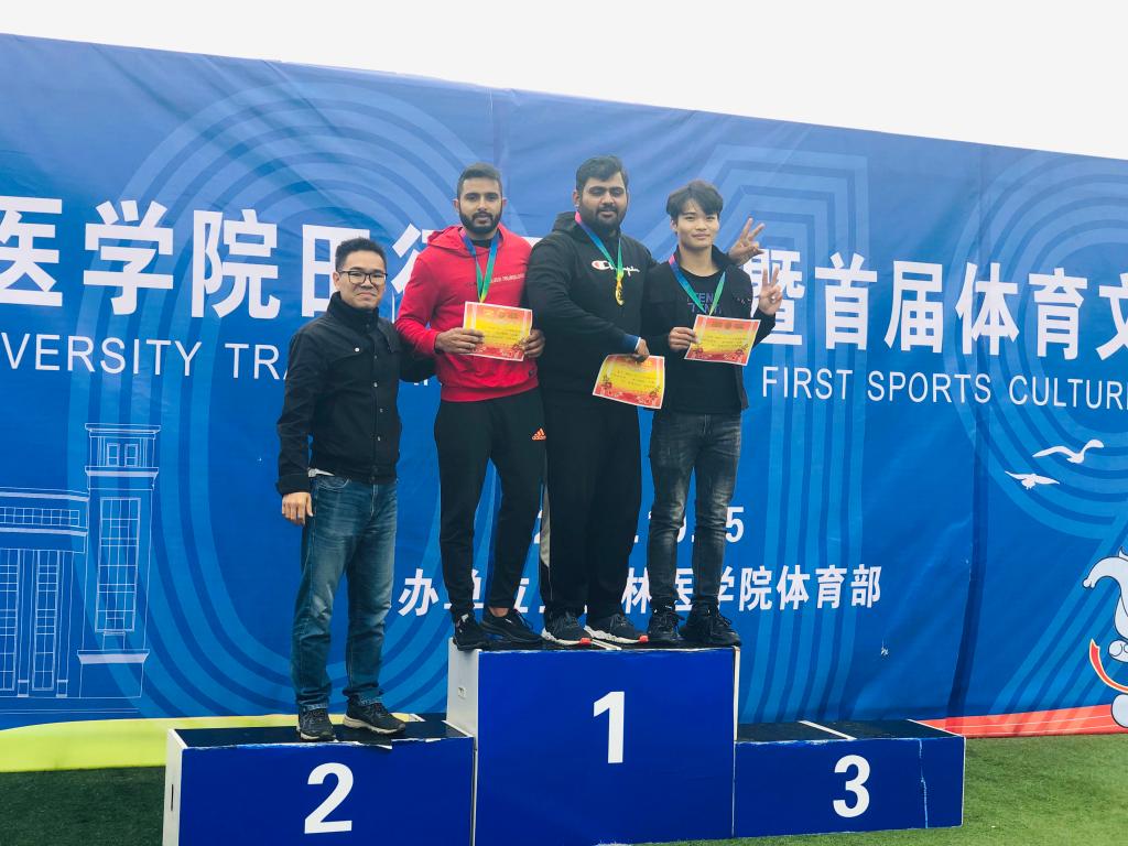 开幕式上,留学生代表队身着白色医护服,迈着整齐的步伐步入会场,成为了开幕式上一道亮丽的风景线。在为期两天的比赛中,留学生健儿们顽强拼搏,勇于超越,先后斩获了7个单项奖和1个团体奖。其中,巴基斯坦籍留学生康武(MAQBOOL HAMZA)荣获男子铅球第一名,印度尼西亚籍留学生幸运(MUHAMMAD FAUZAN ALHADI)荣获男子1分钟足球颠球第一名,并在男子100米、男子400米,男子800米、男子跳远、男子100米接力等项目中获奖。