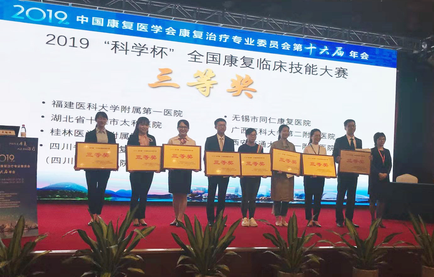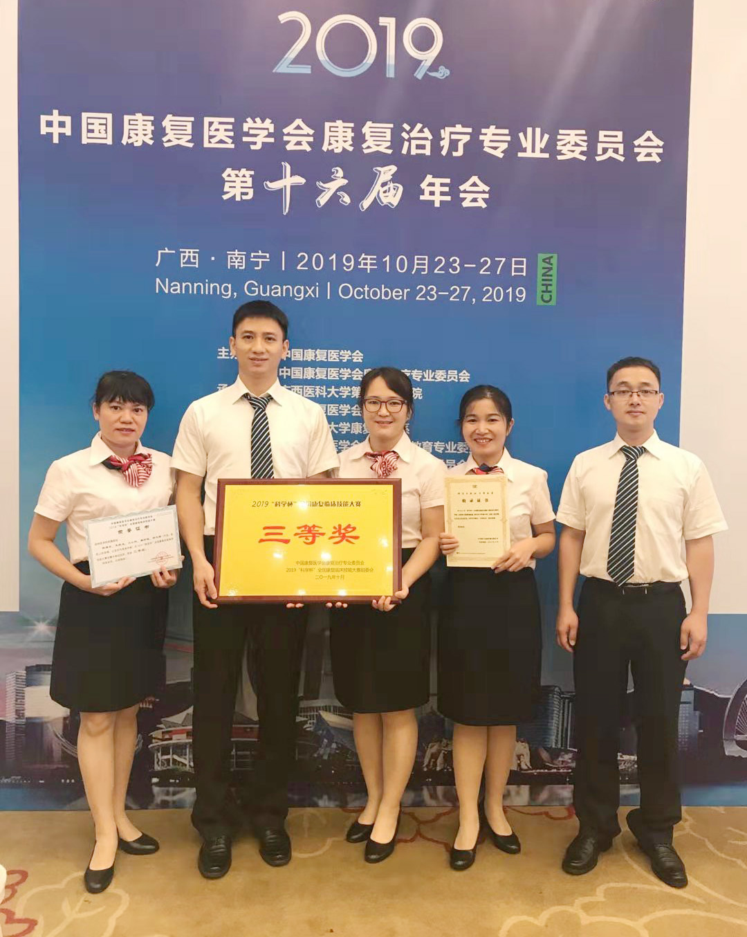 桂林医学院附属医院康复医学科派出了以科室主任杨少华为领队,由朱晓成医生,陈潇泉、文小艳、唐羚健三位治疗师及杨玉梅护士为成员组成的团队参加此次比赛,最终荣获了全国总决赛三等奖。