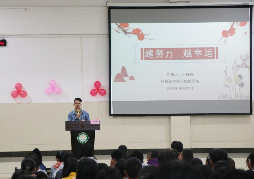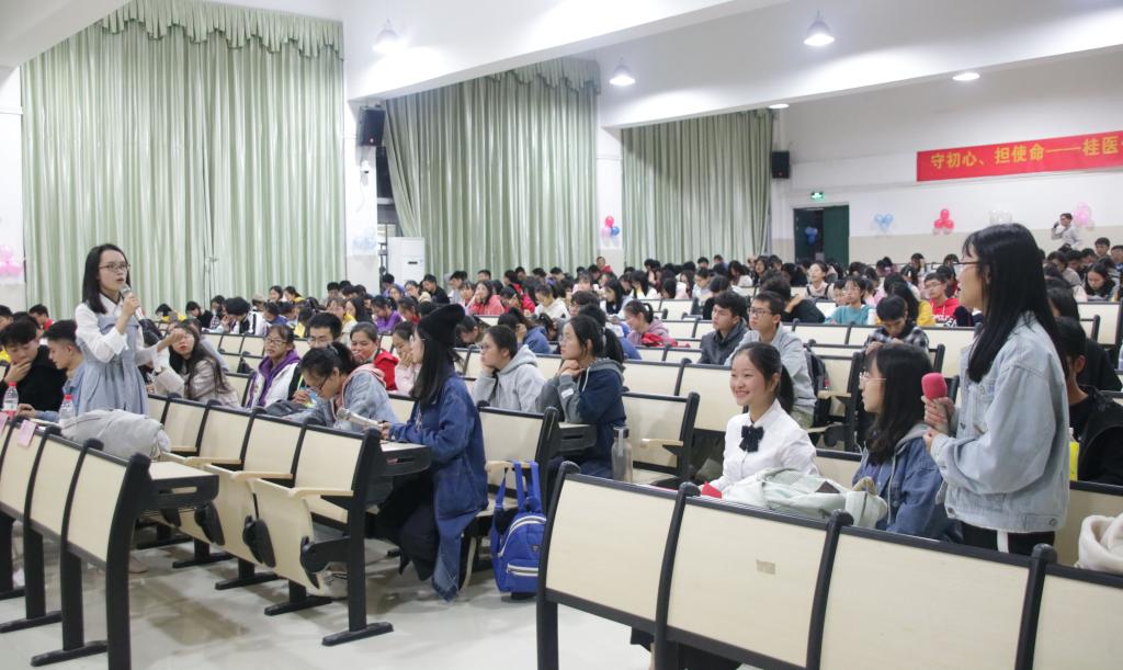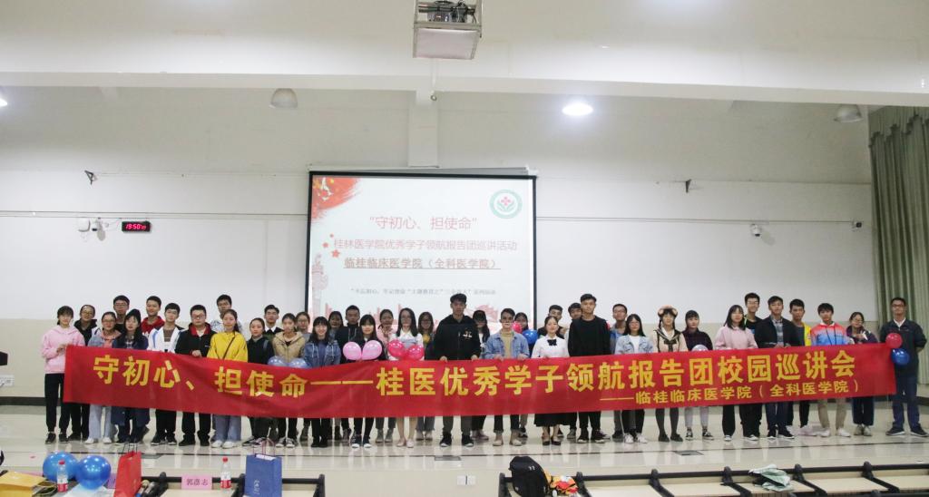 为进一步落实“三全育人”工作,更好地培育和践行社会主义核心价值观,临桂临床医学院(全科医学院)于2019年10月27日下午在教学南楼多功能报告厅举行了桂林医学院优秀学子领航报告团巡讲活动。桂林医学院优秀学子领航报告团成员卢成辉、郭彦志、黄富娟参与巡讲,临桂临床医学院(全科医学院)学工办主任蒋艳平、学院2019级全体新生参加本次活动。