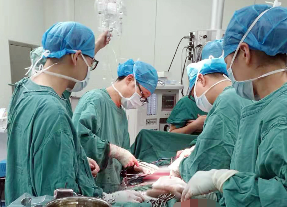 出院后,黄大爷的病情加重,并反复出血,4个月后病情急剧恶化。家属带着黄大爷再次找到菅志远,经过检查,发现黄大爷腹腔内的肿瘤较4月前有明显增大,并且已经侵犯了胰腺、脾脏及横结肠。由于黄大爷年龄太大、心肺功能差,而且出现了重度贫血,但菅志远团队经过慎重讨论后,还是认为肿瘤虽明显进展,但并未出现远处转移,仍可能完整切除,为黄大爷赢得生机。在与患者家属及家属沟通后,家属和患者同意手术。经过充分的术前准备,菅志远手术团队在麻醉科医生、手术室护士的配合下为黄大爷实施手术。