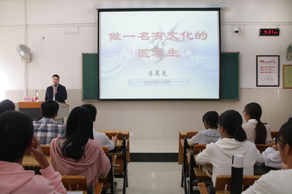 在交流会上,袁晟光分享了他的求学与从医的经历,强调了大学生要有自己的追求,树立自己的目标。他指出,理想和自制力是奋斗的动力,当代大学生应持续努力和培养自学能力,并不断丰富临床经验,实事求是、谦虚好问,从现在开始肩负起对患者的责任。随后,袁晟光以《做一名有文化的医学生》为题,通过讲述文化的定义、文化的重要性来展开介绍中国传统文化和中国当代文化,阐述了文化的多样性和文化的特点,指出文化是“合而不同”的,大学生应以辩证的眼光来看待文化,取其精华,去其糟粕。其中,袁晟光重点强调了中国传统医德的内涵,要求大学生以“德”来待人接物,学习医学人文精神,培养医学生的医学人文素养,做一个有文化的医学生,从而更好地迎接未来的医学道路。