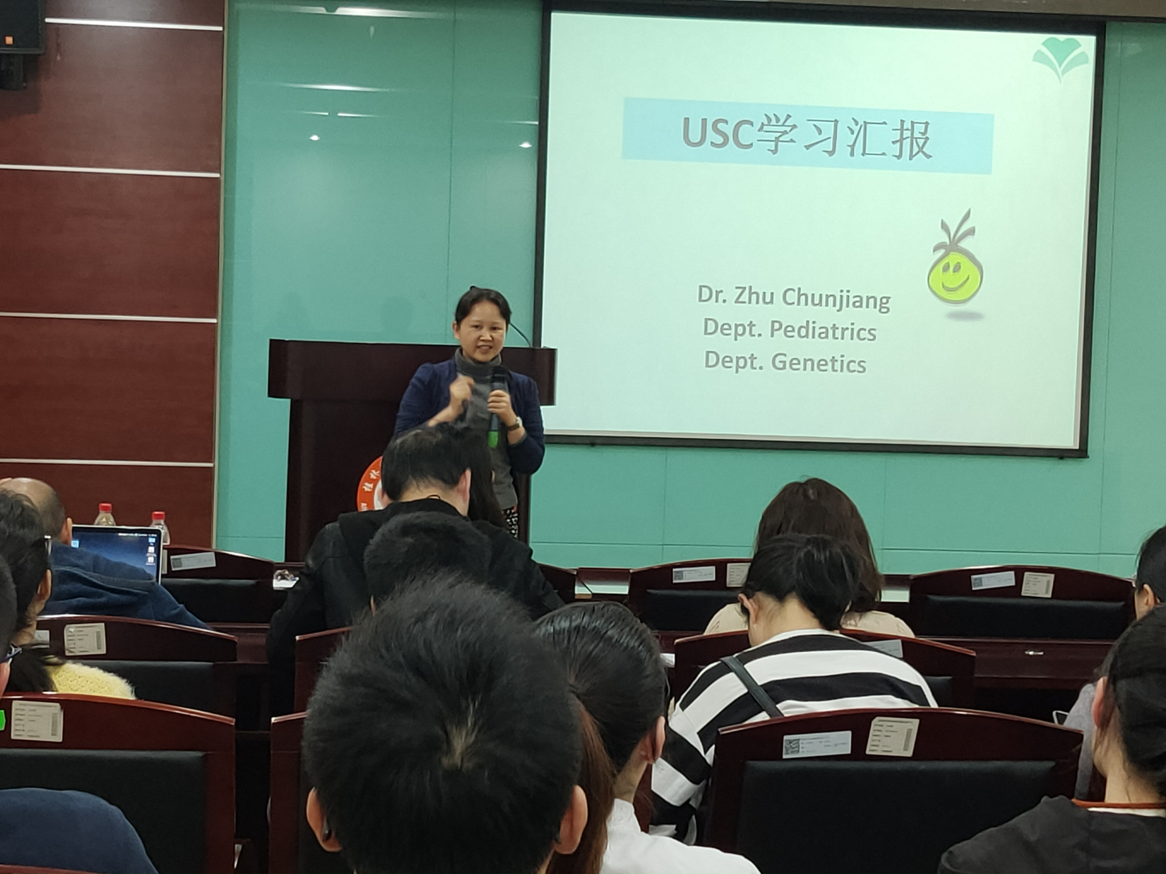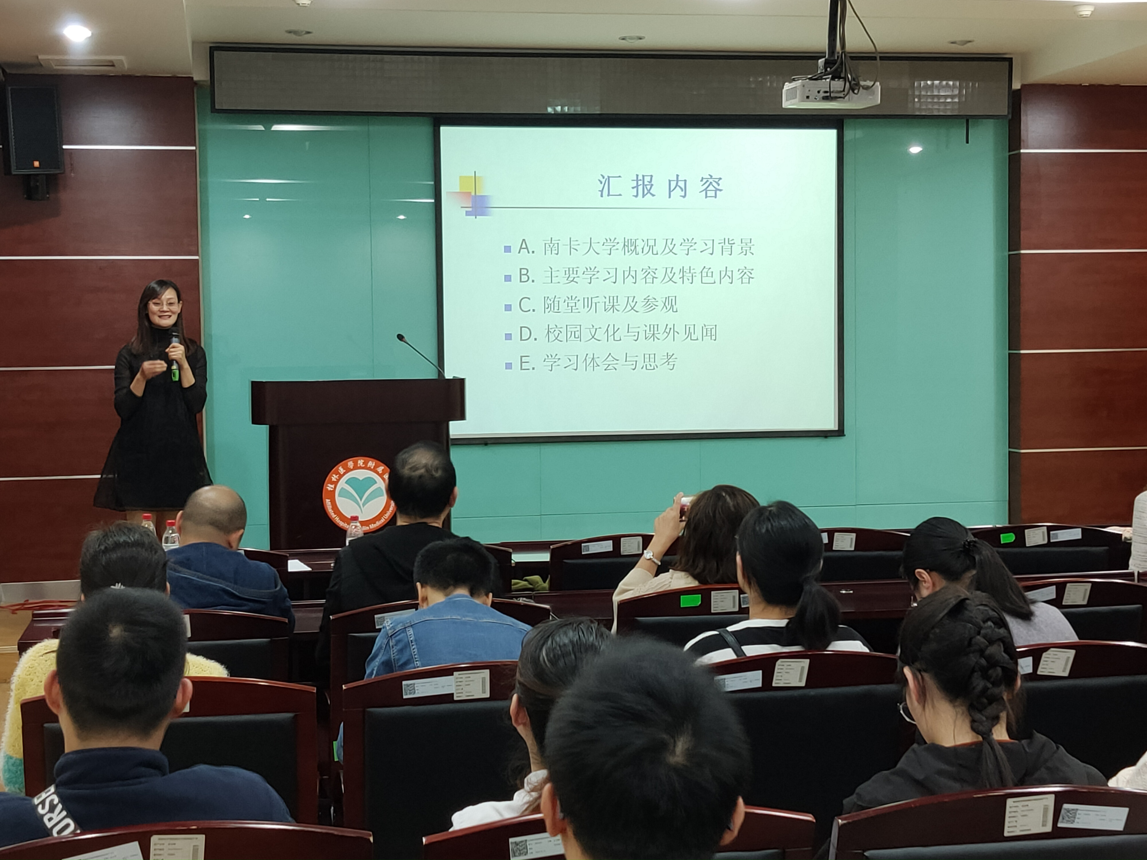 朱春江介绍了在南卡罗来纳大学的学习安排、参观交流、文化体验等活动,重点就新的教学方法、教学理念、教师自我提升等方面分享了自己收获、体会和教学实践经验。她还就南卡儿童医院的独特设计、就医环境、医院管理、人文关怀等谈了体会和见解。