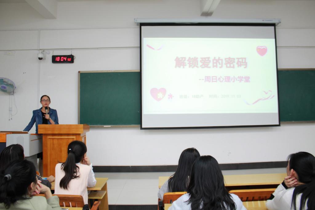 为了使此次学习活动顺利开展,18助产班成立了班级心理工作小组,由辅导员任组长,心理委员任副组长。班级心理工作小组通过收集同学们的心理困惑,查找资料,自主学习等方式做了一系列前期准备工作,终于在11月3日,正式实现首次集体学习,跨出了班级人人学习心理学的第一步。班级心理工作小组希望通过此次周日心理小学堂的开启,广泛开展科普宣传和健康教育,引导动员全班同学共同参与心理健康促进行动。该项学习的主题确定为“解锁爱的密码”。班级心理工作小组认为心理问题的根源是没有找到“爱的密码”,心中有爱,推己及人,方会收获心灵成长。