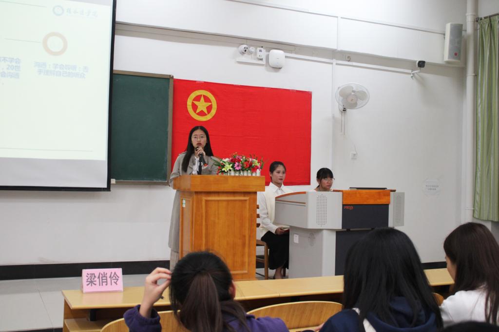 梁俏伶以《做一个有高度、有温度、有态度的学生干部》为主题,从自身的学生干部历程为切入点,提出作为一名学生干部应做到学习工作两手抓,敢于甘于做奉献;要培养“三心”、“三力”和“三性”;需摆正工作态度,主动承担责任,才能走好学生干部这条道路。
