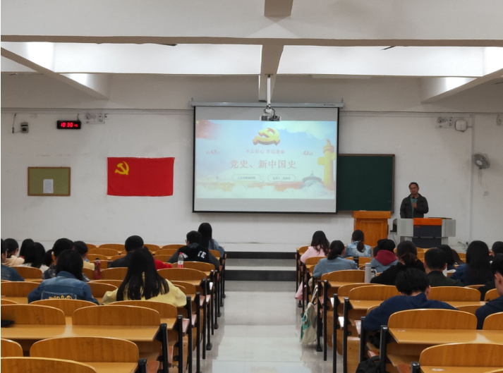 学习党史、新中国史既是贯彻习近平总书记重要指示精神的政治任务,也是 “不忘初心、牢记使命”主题教育的重要内容,学院党委高度重视,持续组织开展了形式多样的专题学习。为进一步教育引导我院学生党员铭记革命历史、继承革命精神、传承红色基因,把知史爱党、知史爱国作为共产党员的终身课题,不断检视自己、提高自己,切实增强“守初心、担使命”的思想自觉和行动自觉,始终坚守共产党人的精神追求和政治本色, 2019年11月13日晚,学院党委副书记阳荣华在教学北楼103面向全体在校学生党员讲党史、新中国史。