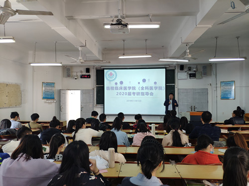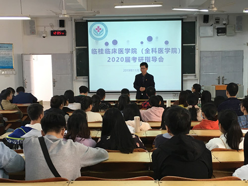 为扎实做好毕业生就业工作,做好就业精细分类指导,临桂临床医学院(全科医学院)于2019年11月15日中午在东城校区cr306举行2020届毕业生考研指导会,桂林医学院继续教育学院院长高东、桂林医学院第二附属医院(临桂临床医学院、全科医学院)党委副书记刘梦青、全体专兼职辅导员以及2015级临桂临床本科班报考研究生学生参加此次活动。