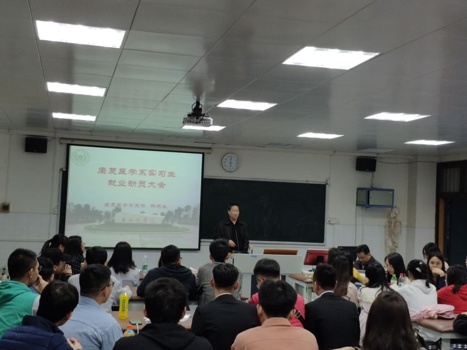 人生伟业的建立,不在能知,乃在能行。为激励康复医学系实习生积极就业,奋勇争先,勇挑重担。11月14日晚,康复医学系实习生就业动员大会于东城校区科教楼实训室举行,康复医学系主任陈廷生、副主任孔繁荣、康复医学系办公室主任海华、康复医学系教学管理科科长叶化、康复医学系辅导员彭丽媛以及2016级康复治疗学本科班学生参加了此次会议。