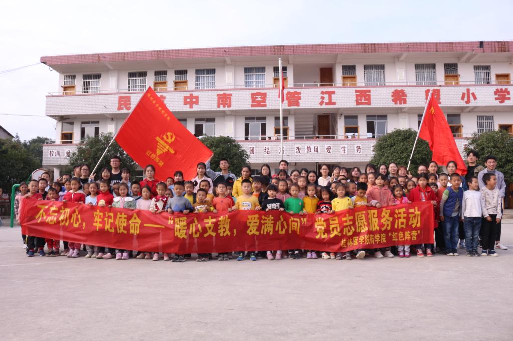 为深入学习贯彻党的十九大精神,落实“不忘初心,牢记使命”主题教育,提高学生党员的思想政治素质与社会实践服务能力,药学院于2019年11月20日下午在桂林市临桂区四塘镇江西小学开展了以“不忘初心,牢记使命——暖心支教,爱满心间”为主题的党员义工支教活动,药学院学生党员、入党积极分子代表及“红色阵营”部分成员参与了本次活动。