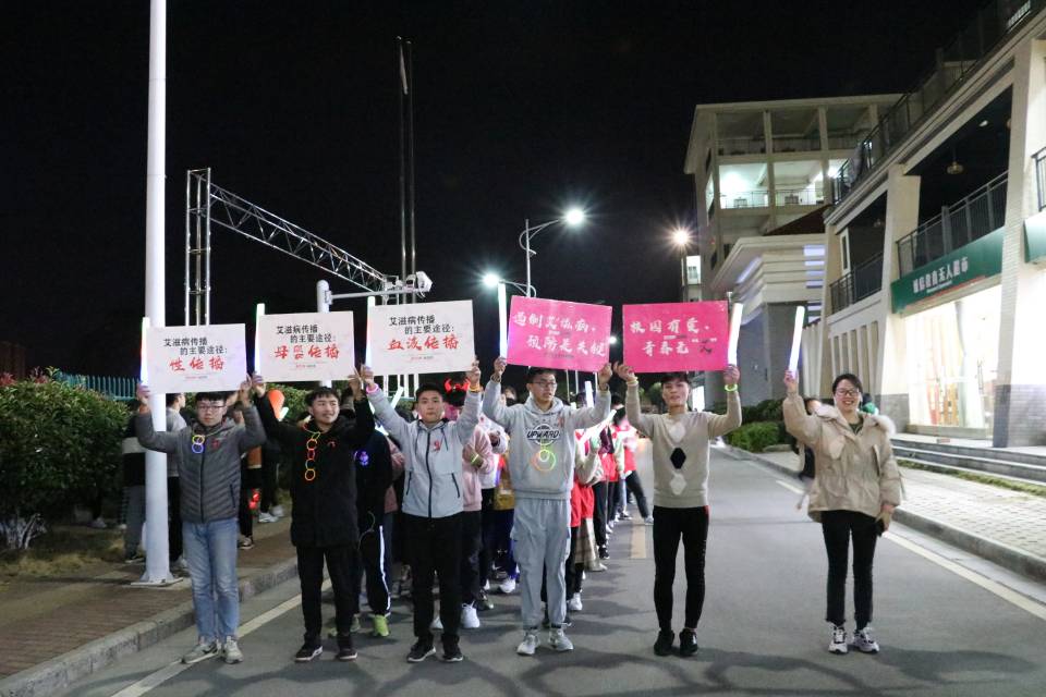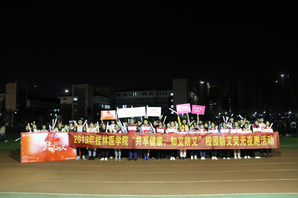 为积极响应自治区卫生健康委、自治区教育厅联合主办的2019年广西高校防治艾滋病系列宣传活动,并进一步加强艾滋病防治宣传教育。2019年12月3日下午18时,我校在临桂校区举行了2019年桂林医学院“共享健康,知艾防艾”校园荧光夜跑活动。校团委陶光均老师、徐聪聪老师和200余名志愿者共同参与了本次活动。