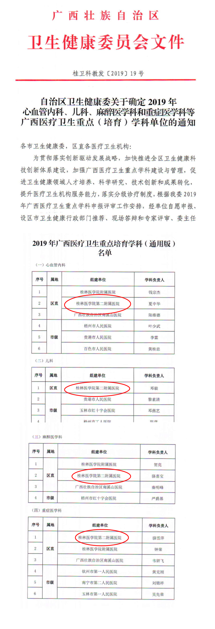 日前,广西卫健委公布了《自治区卫生健康委关于确定2019年心血管内科、儿科、麻醉医学科和重症医学科等广西医疗卫生重点 (培育)学科单位的通知》其中:桂林医学院第二附属医院的心血管内科、儿科、麻醉医学科、重症医学科等四个学科成功入选重点培育学科,为获得培育学科数量最多的医院。