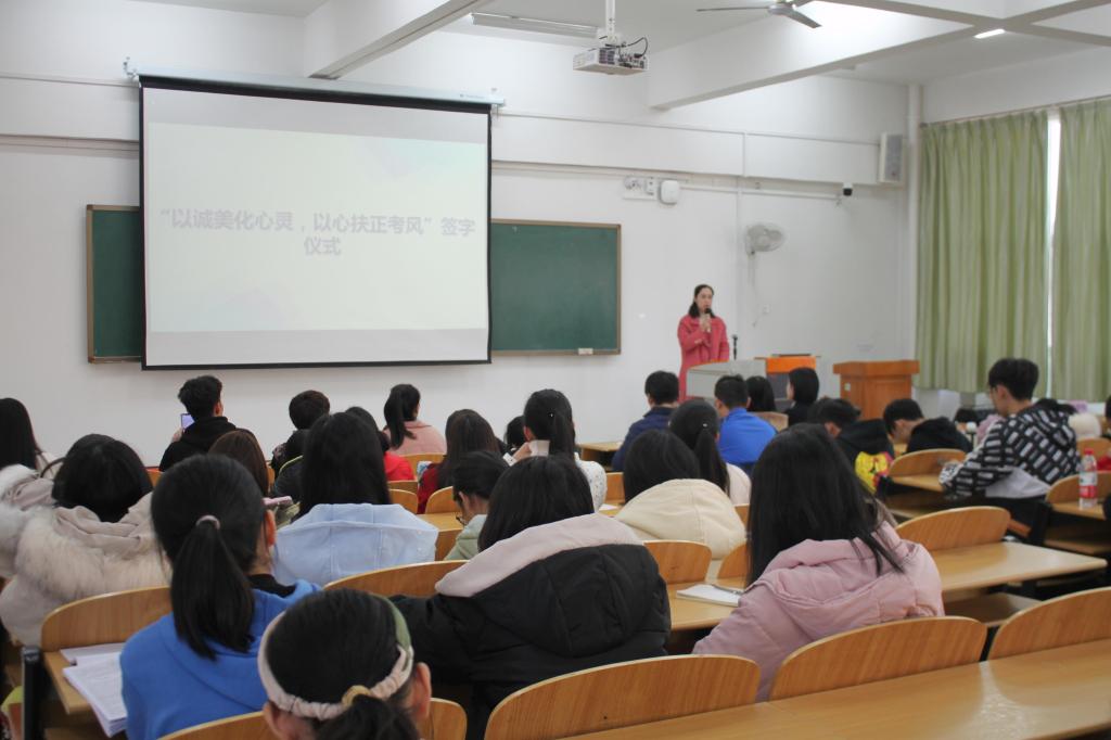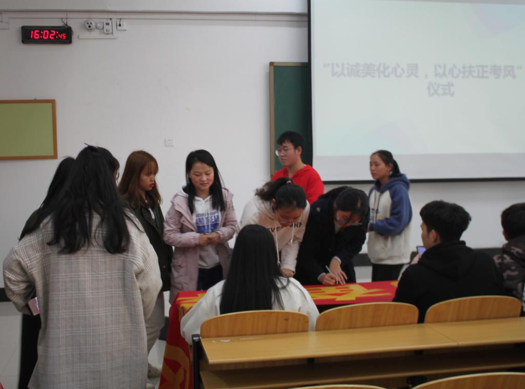 活动伊始,黄艳芸老师着重对课堂玩手机现象提出看法,提倡课堂无手机,当代青年大学生应认真学习,把时间多花在钻研学习上,并希望通过此次签字仪式来引导同学们加强自我管理、严守校纪校规。活动最后,在老师的带领下,同学们一起在“扬勤奋学风,自律伴你我”横幅上签下自己的名字,以此作为往后学习及生活中严于律己的凭证,时刻在心中敲响规范自我行为的警钟。