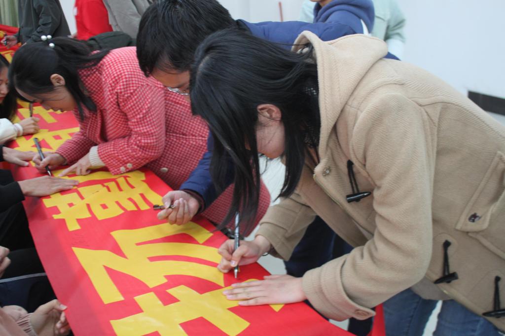 (老师和同学们在横幅上签名)