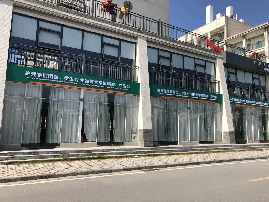 由一轴(新时代大学生党建文化中心)和两翼(东街、西街)构成的思想政治教育基地,是桂林医学院落实大学生思想政治教育成效的重要载体。为升级思想政治教育阵地形象,推广学校的视觉识别系统应用,后勤管理处对“两翼”之东街进行了全新美化,以视觉识别系统的蓬勃绿为主色,统一设计了办公室招牌。美化后的东街与新华书店阅读体验中心互相映衬,与校园形象进一步相融,为宣传部、学工处、校团委等部门的下设组织的工作环境带来升级。