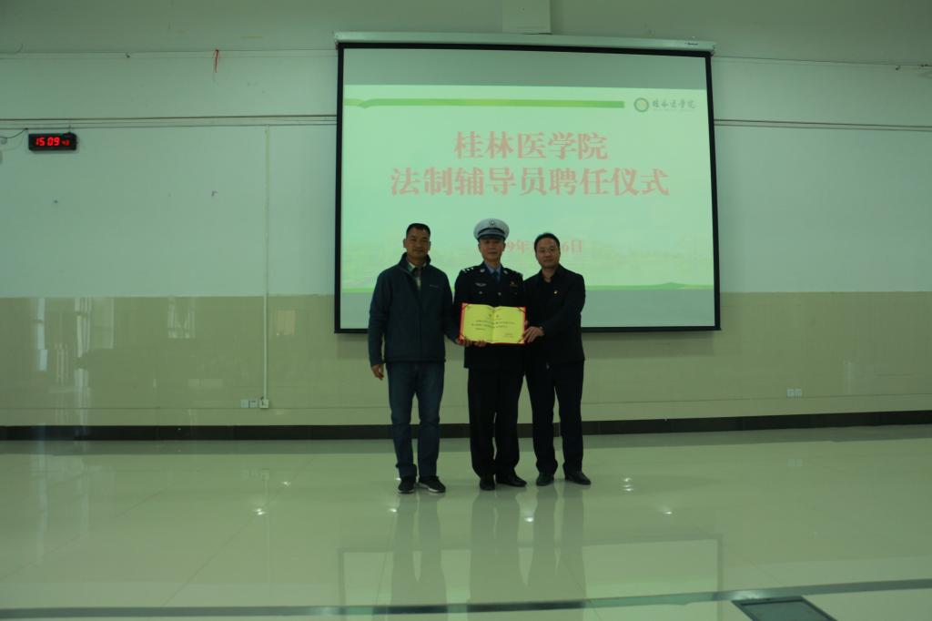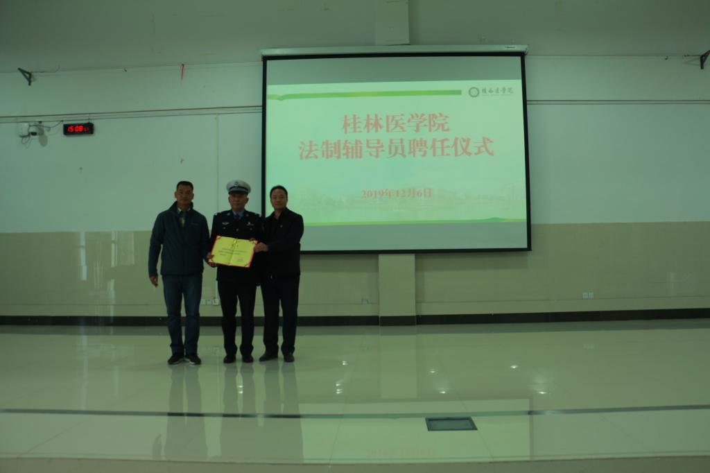 讲座之前,学生工作处领导、校保卫处领导为裘晖副支队长、蒋川辉科长颁发桂林医学院法制辅导员聘书。法制辅导员的聘任是我校推进“三全”育人工作的一项重要举措,发挥法制辅导员防护引导作用,正确引导学生健康成长,预防学生违法犯罪,对提升我校学生的法制和安全意识具有重要意义。