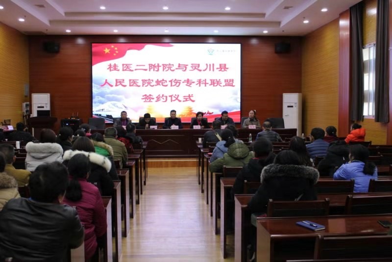 12月20日下午,第二附属医院与灵川县人民医院正式签约蛇伤专科联盟,第二附属医院将与联盟医院完善蛇伤救治治疗网,尽可能让蛇伤病患得到最优、最快捷的诊疗服务。