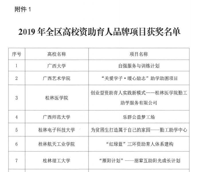 为促进高校资助育人优秀项目建设,全面提升资助育人水平,自治区教育厅组织开展了2019年全区资助育人项目评选活动,评选出高校资助育人品牌项目10项,我校学生工作部(处)、创新创业教育学院联合报送的资助育人项目《创业型资助育人实践新模式—桂林医学院勤工助学服务有限公司》荣获全区高校资助育人“品牌项目”奖项。