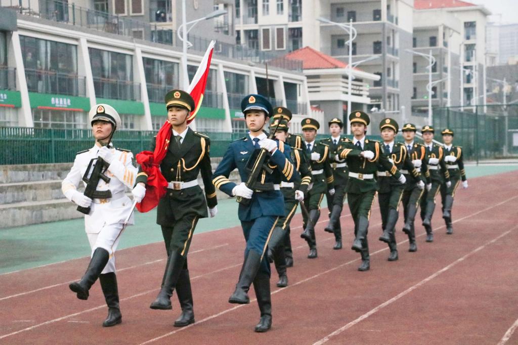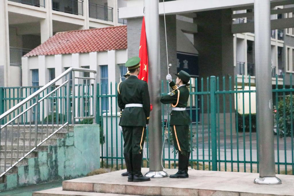 迎着2020年第一个清晨的朝阳,国旗护卫队迈着坚定的步伐,精神抖擞地将国旗护送至升旗台。在场师生怀揣着崭新一年到来的喜悦和对国旗的崇敬之情大声齐唱国歌,鲜艳的五星红旗也在歌声中冉冉升起。