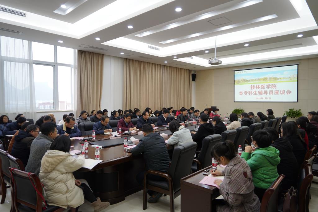 1月3日下午,在临桂校区明德楼502会议室,校党委书记黄照权、校党委副书记王赣华参加本专科生专兼职辅导员座谈会。学生工作部(处)、校团委全体人员,各二级学院分管学生工作领导,全体专兼职辅导员参加座谈会。会议由王赣华主持。