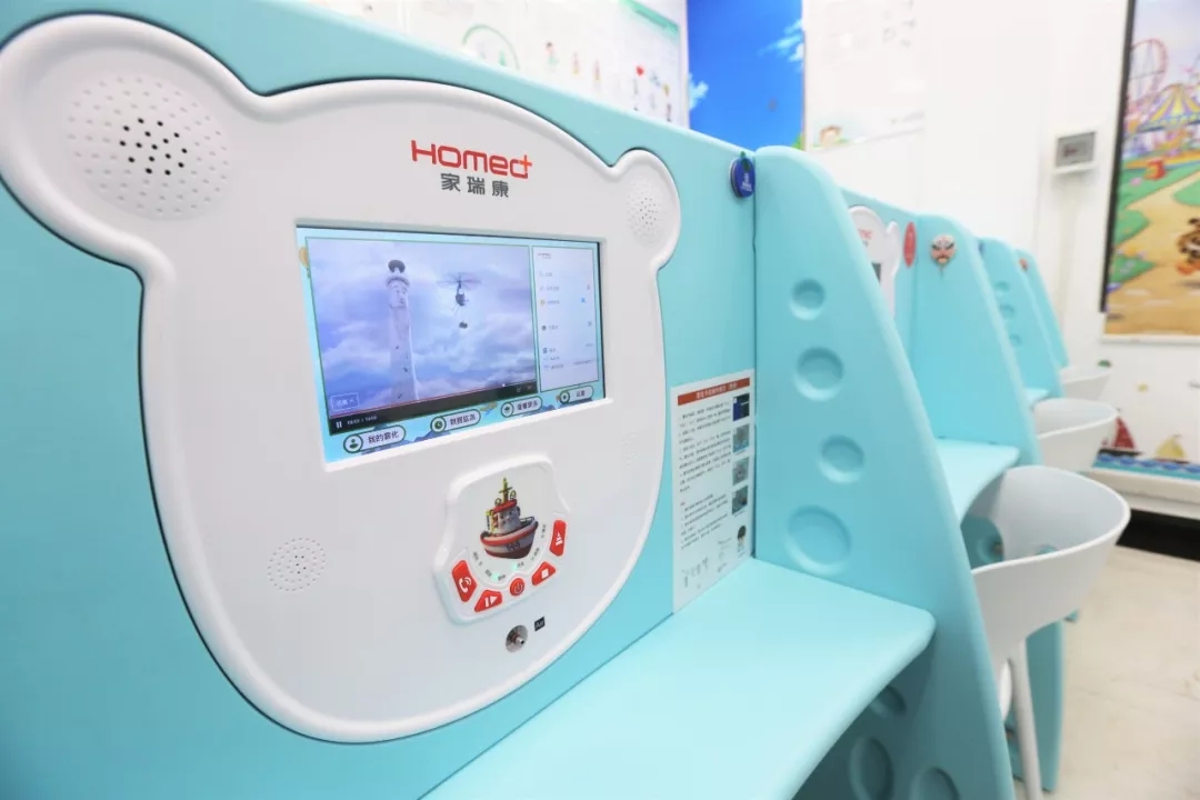 儿童雾化室引进了目前国内最先进的智能雾化室,通过“移动+服务+治疗”的智能雾化一体解决方案,设有12个独立的卡通独立卡座,配备智能雾化机和触控式平板电脑,单独卡位设计可以使患儿有一个相对独立的空间,减少交叉感染的风险;同时循环播放幼儿喜爱的动画片,减少孩子们雾化治疗的恐惧感,提升治疗效果。
