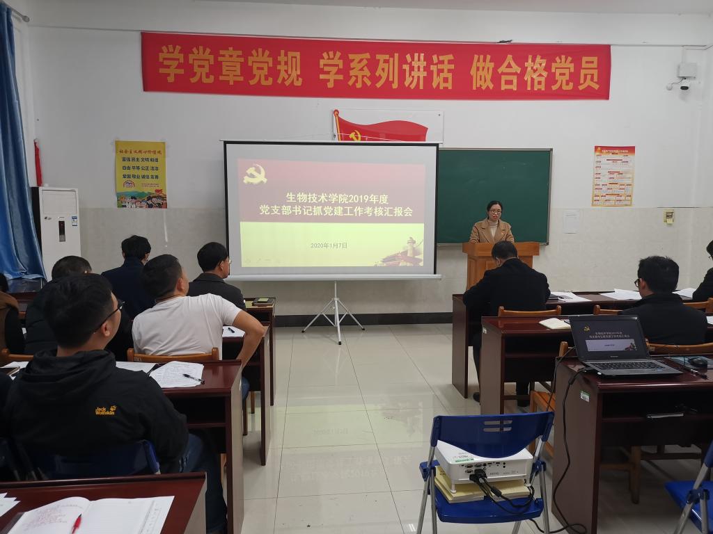 为深入贯彻落实党要管党、全面从严治党的方针,深入推进基层党建与学院工作深度融合,进一步检验基层党支部书记抓党建工作情况,1月7日上午,生物技术学院在学院“党员之家”召开2019年度党支部书记抓党建工作述职评议会。学院党政领导、党支部委员、教研室主任、部分党员和群众代表参加了会议。会议由党总支委员、副院长顾生玖主持。