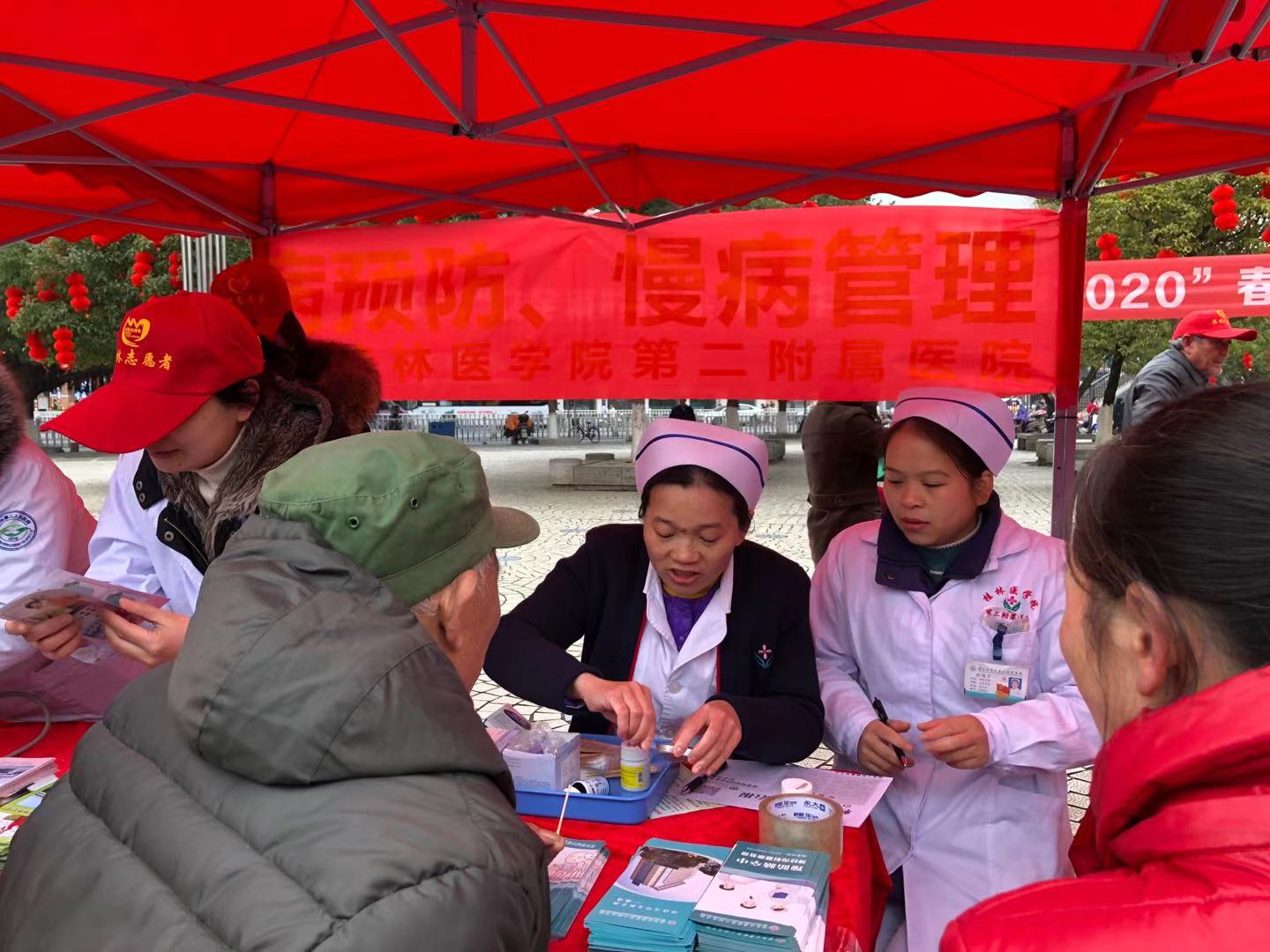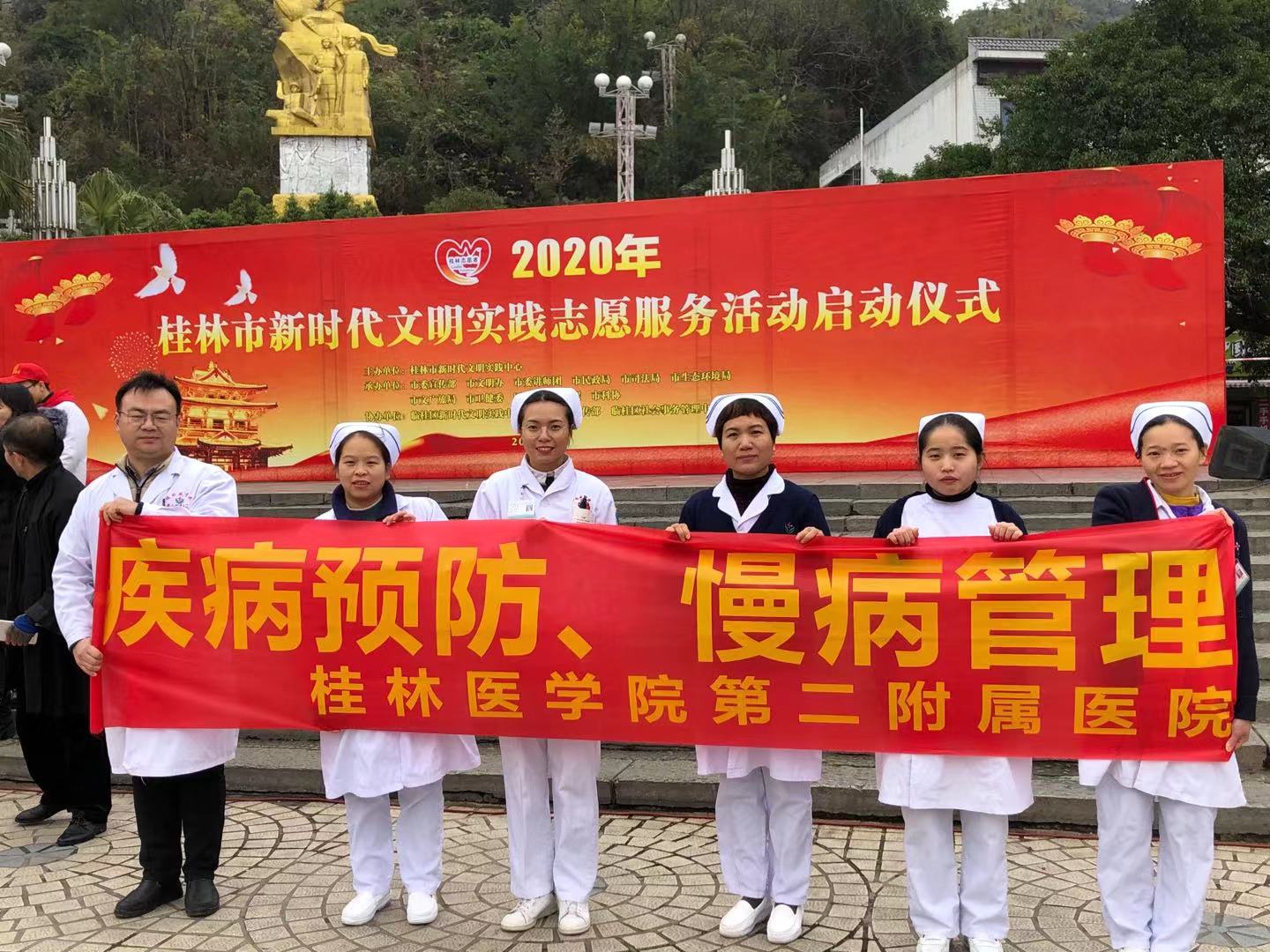 1月17日上午,2020年桂林市新时代文明实践志愿服务活动正式启动,近20支市新时代文明实践志愿服务队、社会组织新时代文明实践志愿服务队、临桂各社区志愿服务队代表共300多人开展了集中志愿服务活动。这个寒风凛冽的早晨,桂林医学院第二附属医院委派急诊科、肿瘤内科、呼吸科及神经内科参加了此次活动,并开展了“慢病防治、慢病管理”社区宣传义诊活动。