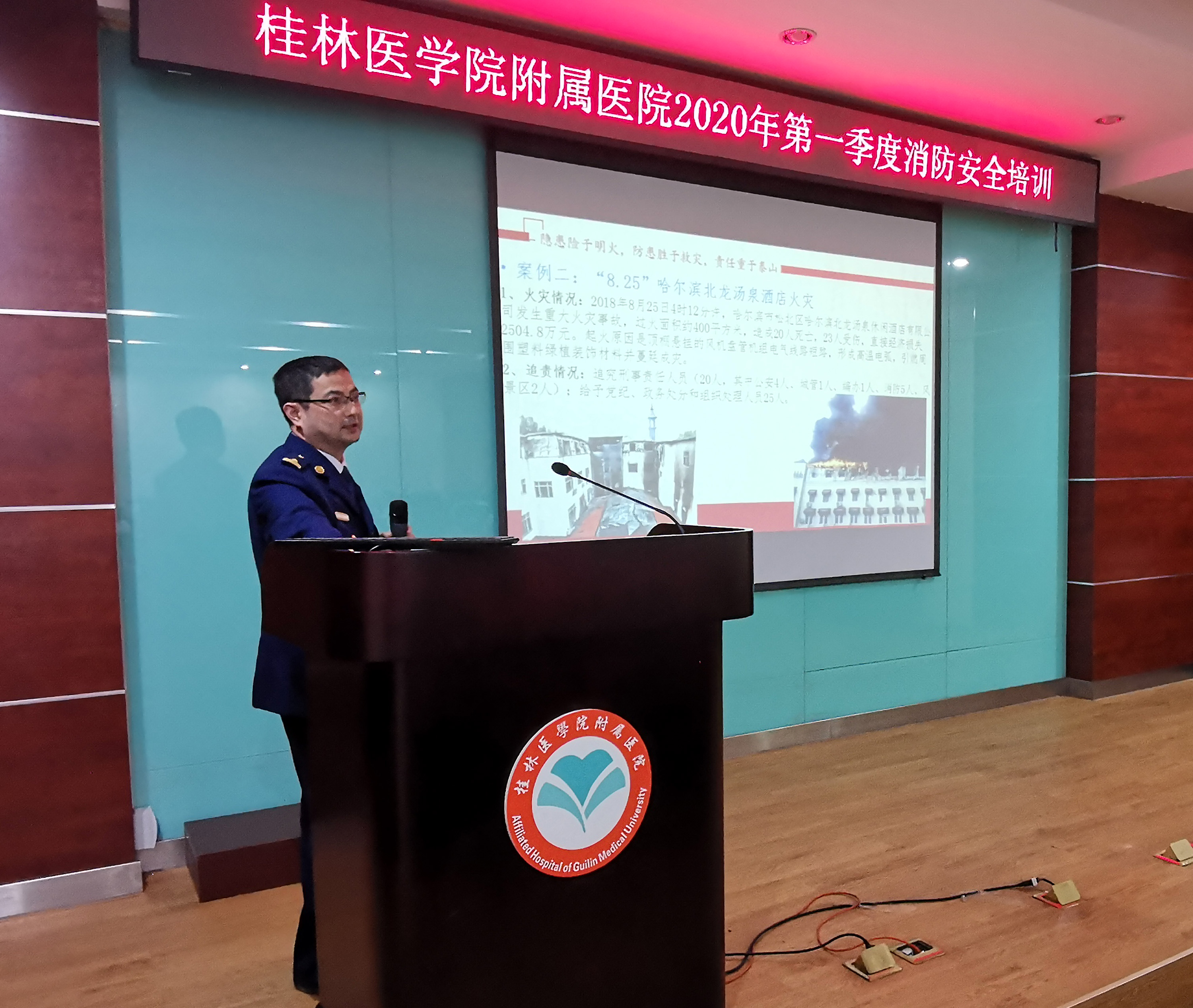 桂林市消防支队防火处处长唐锋受邀为附属医院安全员和保卫科人员作了题为《消防安全培训》的讲座。他从分享火灾监控视频开始,告诫大家火灾发生的严重后果及深刻的教训。他围绕火灾预防与应急处置方法、消防安全管理、火灾事故责任追究案例,严格按照自治区消防安全要求,深入浅出地讲解了扑救初期火灾应具备的基本能力和重要性。