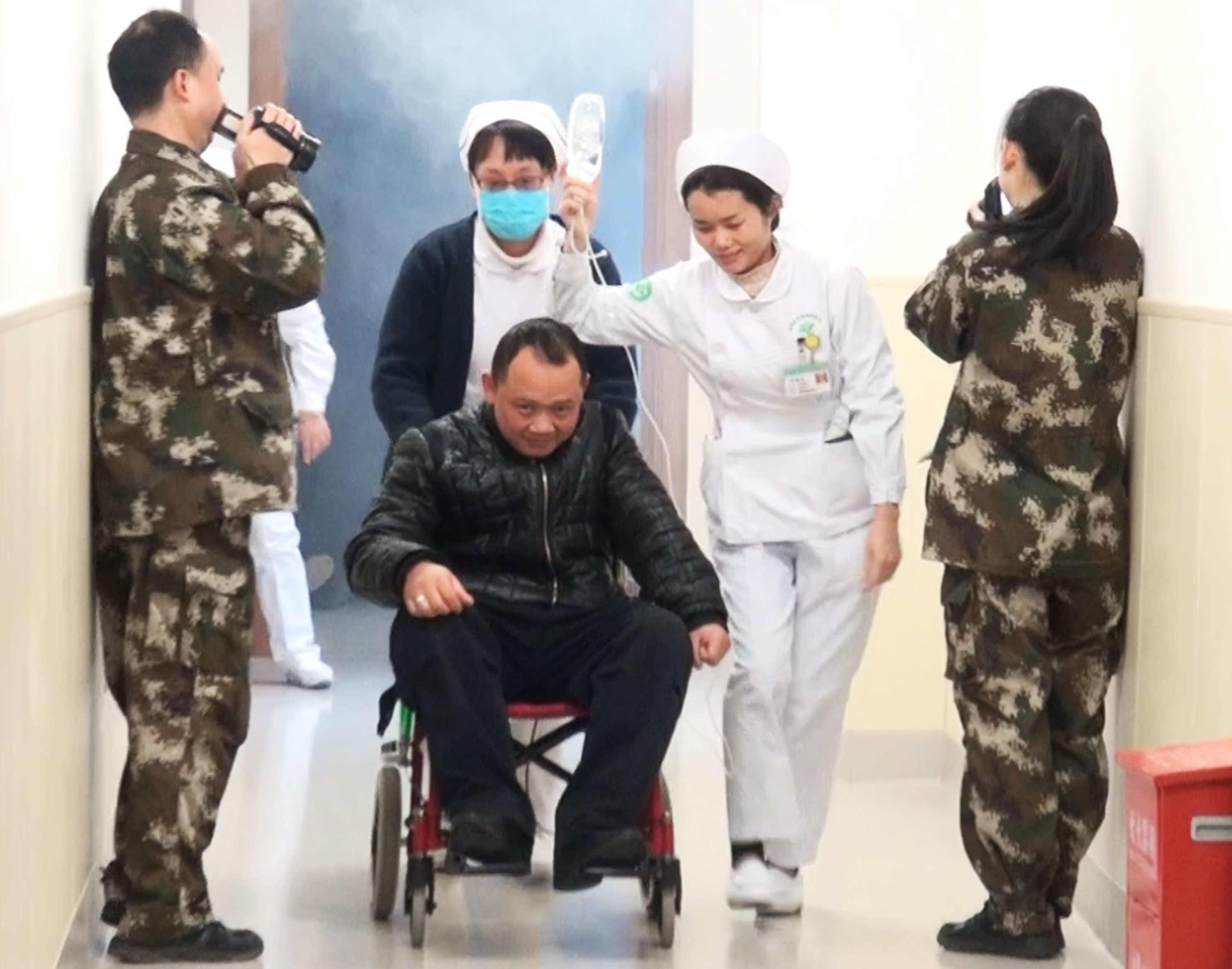 演练现场医务人员疏散“病人”