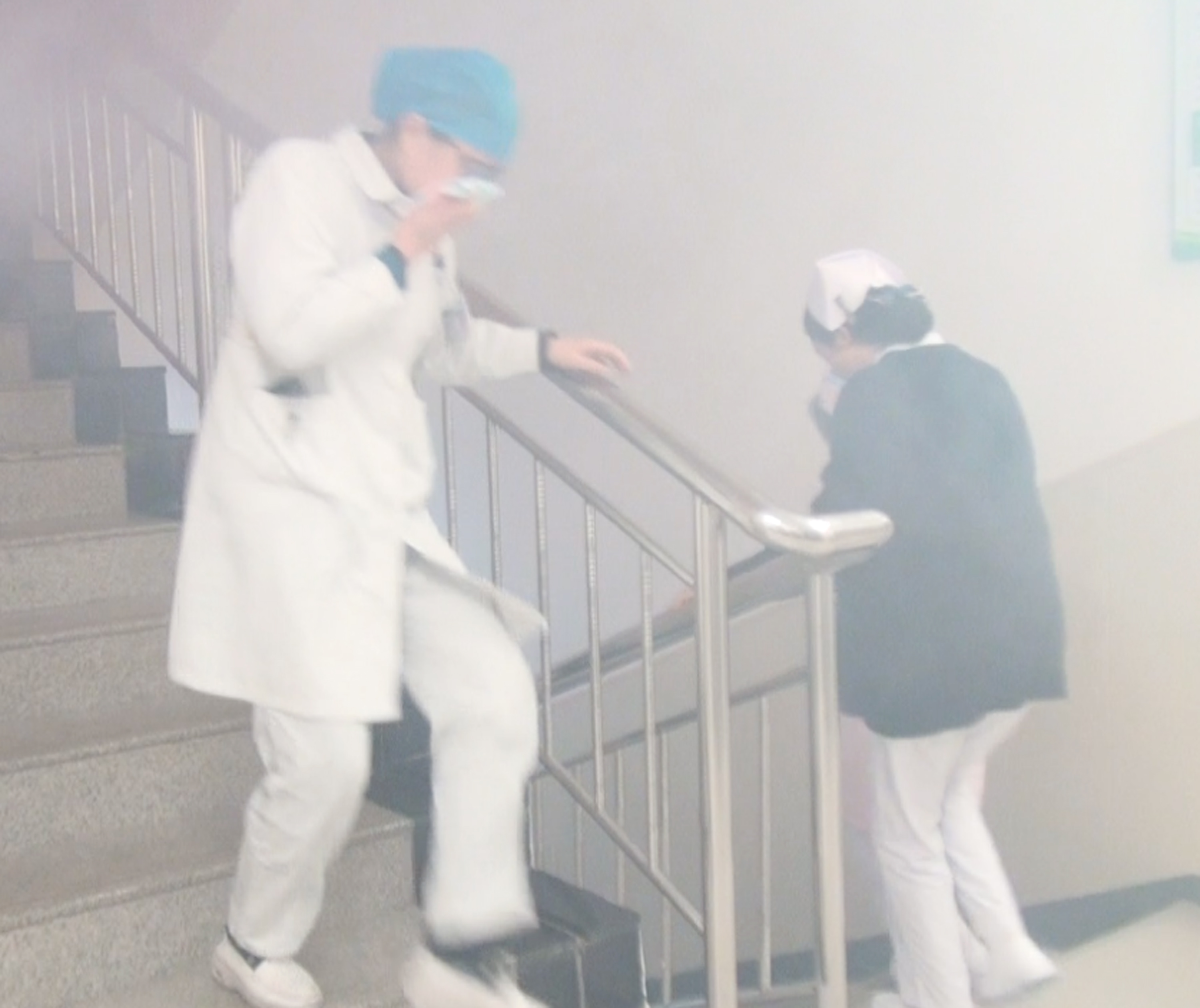 演练现场保安人员指导医务工作者消防通道“逃生”