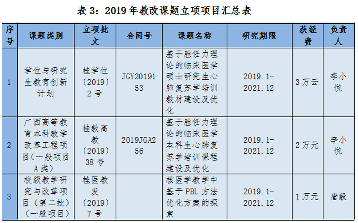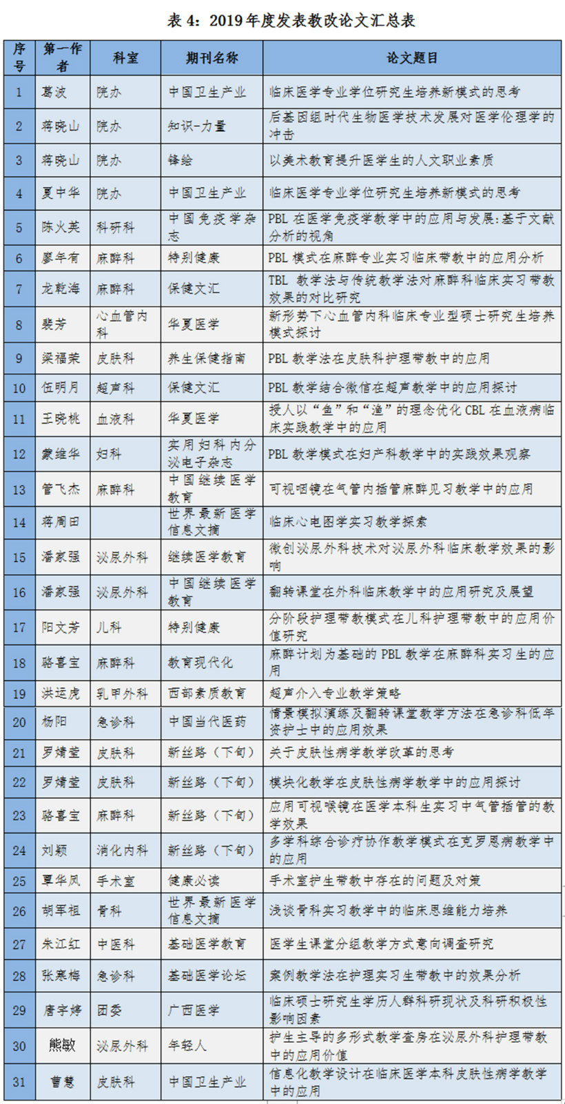 二、针对临床教学特点,积极开展各类教学方法的改革探索,注重分析和总结经验。2019年我院获教改课题立项3项, 发表教改论文31篇,具体见表3和表4。