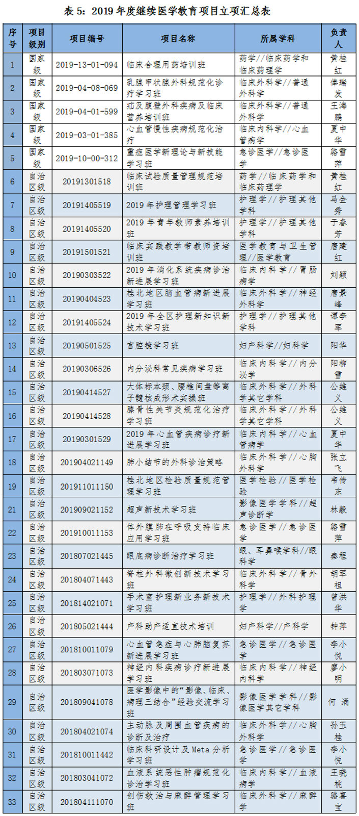 三、为充分发挥医学院校附属医院服务和培训区域内医疗卫生人员的职能,我院专家积极申报各级继续医学教育项目,2019年度共立项33项,其中国家级5项,自治区级28项,具体项目见表5