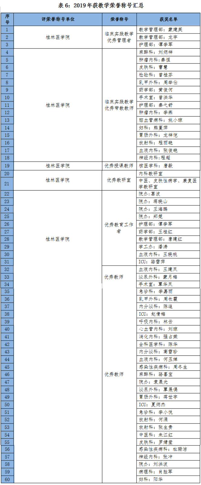 四、为激励教师的教学积极性,发挥优秀教师的引领带动作用,2019年开展各类教师评先评优活动,共60人次获各类荣誉称号,具体见表6