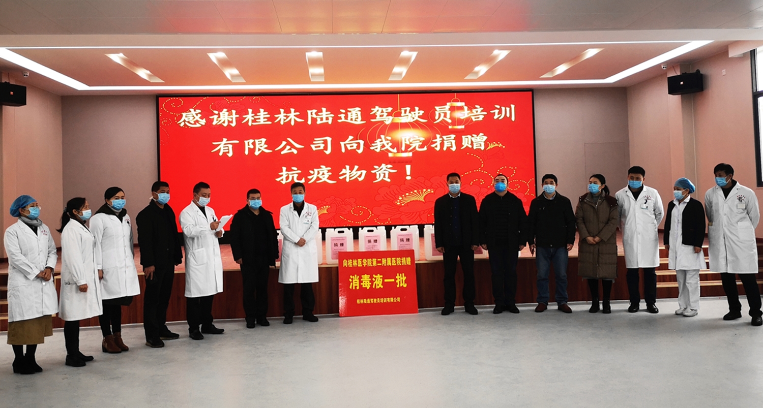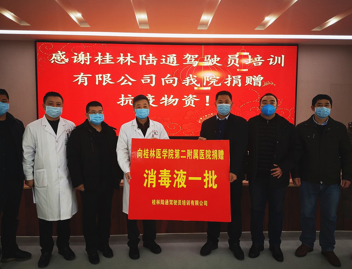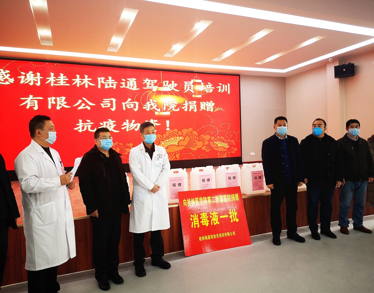 疫情无情人有情。2月5日上午,桂林陆通驾驶员培训有限公司向桂林医学院第二附属医院捐赠了500斤消毒原液,助力疫情防控。医院党委书记宋剑非、党委副书记刘梦青、副院长王海鹏及医院部分中层干部出席了捐赠仪式。