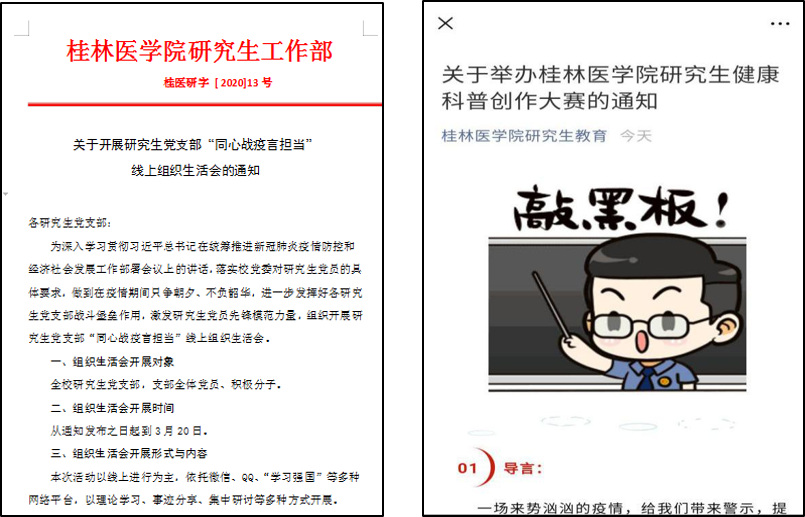 生命重于泰山,抗疫在举群力。在疫情防控攻坚期,研工团队迎难而上,凝心聚力,坚定信心,采用实际行动为武汉打气,为中国加油。研究生导师石武祥待留校学生为亲人,让其居住在自己家中,全程监护、指导其开展科研论文写作;研工部唐劲礼老师在扎实做好研究生的疫情防控工作时,主动投身临桂校区的疫情检查志愿活动,共筑校园“防护墙”。2018级临床专硕刘祎皓等10名研究生志愿者们虽然不能身赴前线,但他们践行“弘德善医”的校训精神,发挥专业优势,坚守在家乡防疫一线,传承着“白衣天使”的大爱无疆。2017级临床学硕班黄勃、2018级药学专硕班樊媛媛用手中坚韧的笔头,点燃希望,祝福武汉,致敬英雄。