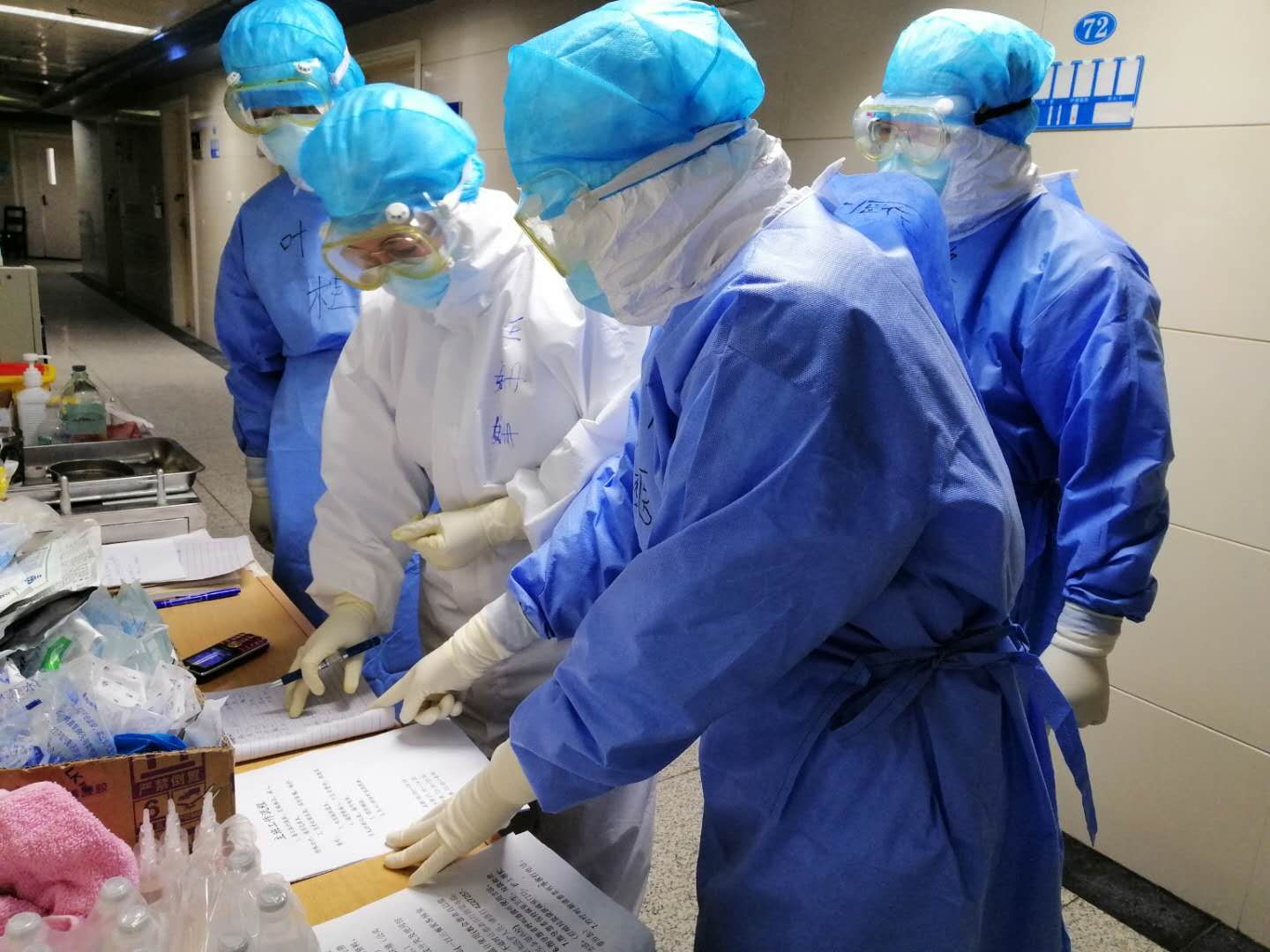 2月18日下午,一名重症病人突发病情变化,当时我们的专家团队在9楼查看鉴别新冠病人,沈主任第一时间在微信上给我留言,当我们赶到7楼重症隔离病房的时候,他已经换上厚厚的隔离衣准备进入隔离病房查看病人病情变化详细情况。我用手机及时记录下了他冲锋在前的那一刻!