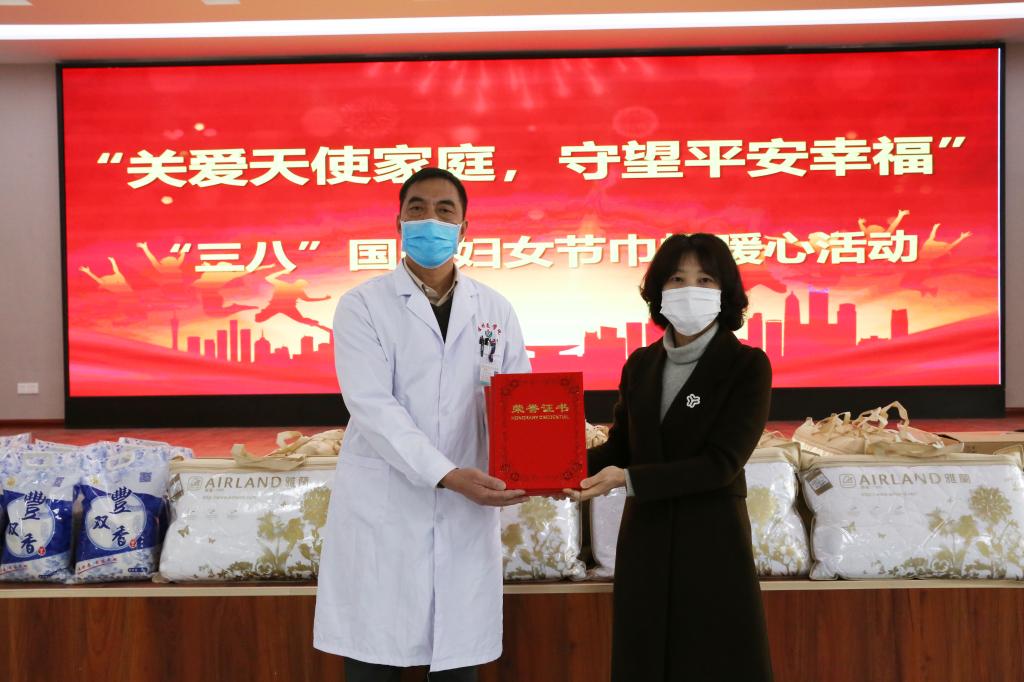 3月6日,桂林市妇联副主席关永兵、桂林市“周末爱心妈妈”一行到第二附属医院看望慰问援湖北抗疫医疗队员家属,并为医院援湖北抗疫医疗队女队员颁发了“三八红旗手”荣誉证书。第二附属医院副院长蒋晓山、组织人事科科长梁金妹、工会副主席何秀凤、支援湖北抗疫医疗队员家属代表参加了本次慰问活动。