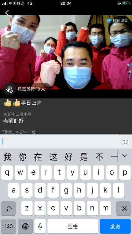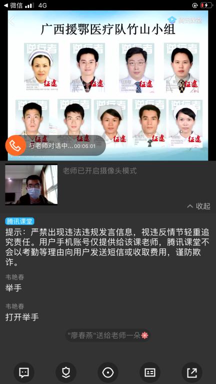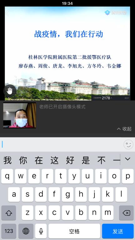 战疫情,共守望。为进一步做好疫情防控期间护理学院师生的思想政治教育工作,结合实际情况,2020年3月7日晚19:30-21:00,护理学院以网络直播的方式开展了以“战疫情,我们在行动”为主题的思政课程讲座。本次讲座由正在驰援湖北的医疗队员主讲,他们是广西对口支援湖北十堰市医疗队桂医附院援鄂医疗队队长廖春燕老师、广西第一批驰援武汉的桂医附院核医学科护士长李强老师,护理学院3500多名师生在线参与并积极互动,讲座气氛非常热烈。
