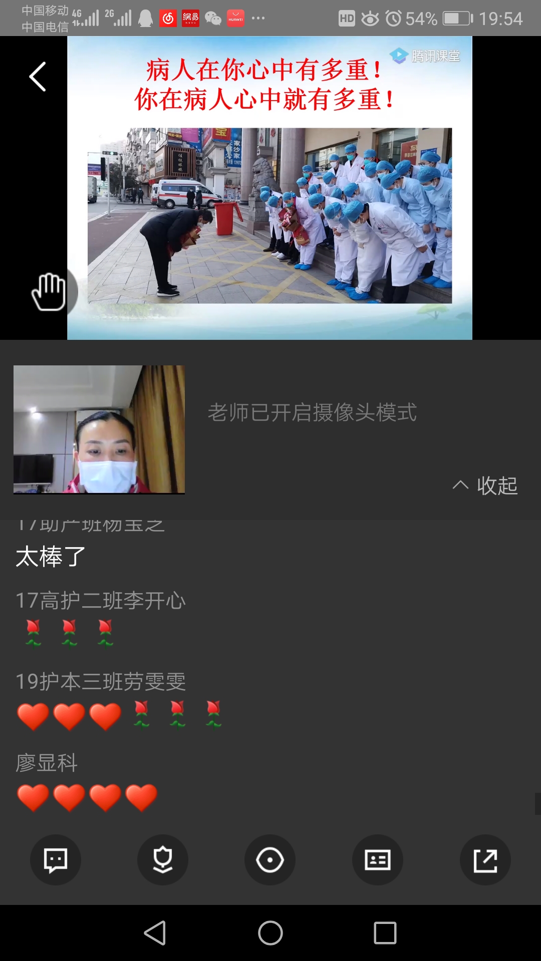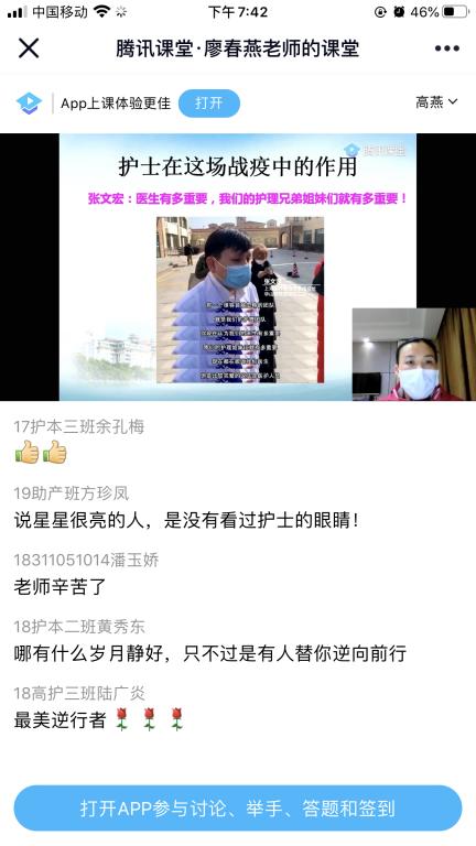 直播期间,廖队长分析了当前的疫情防控数据及医疗队员的基本工作情况,并引用国学经典及临床案例强调了人文关怀在护理工作中的重要性,用行动诠释了作为一名医护人员如何把患者的健康放在最重要的位置。她在讲述中几度哽咽,她的亲身经历和辛苦付出深深地感动了线上的师生们;李护士长以一名重症护理人的骄傲为出发点,强调责任应该与担当贯彻始终,将他的亲身经历与当前中心工作相结合,跟师生们分享了护患之间心灵上的情感沟通;随后,驰援湖北的护理团队们集体亮相,以战“疫”前线饱满的精神状态激励新时代护理青年要以家国情怀勇当民族脊梁,共同建设和谐健康社会。