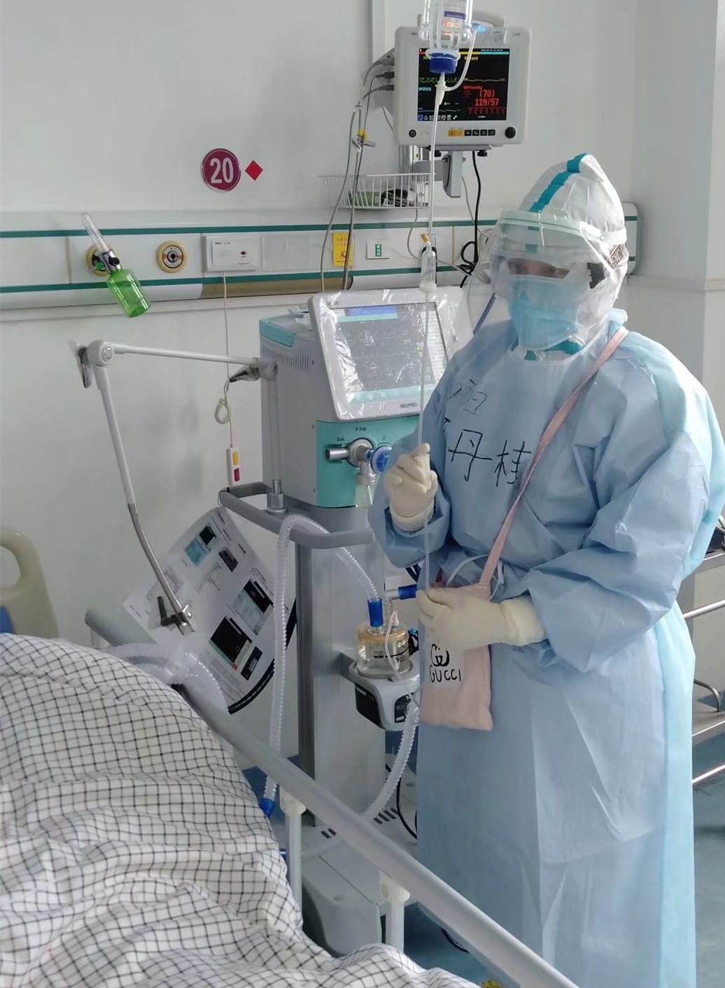 今天,我正式下隔离病区工作。第一次穿上全套的防护装备,我觉得我像身披戒装的战士。和战友们推开最后一道缓冲间的大门进入隔离病区,就抵达真正的战场:隔着厚厚的口罩,依然能闻到浓郁的消毒水味道,看到一个个病人,强烈的职业本能代替了心里一闪而过的慌张,和战友们心照不宣冷静而有序的开展工作。在重症病区里患者相对普通病房要重,我们在监护室里的日常工作是:危重患者的抢救、呼吸机的监测、氧疗、翻身拍背吸痰等人工气道的管理、营养支持、严密监测生命体征、心理护理、患者的基础护理、病房物表擦拭等等。全身全部武装后,刚开始很不习惯,不仅闷得难受,平时很灵活的操作在戴着两三层手套下变得不灵活了,几个操作下来,时常被闷得全身湿透、防护镜上雾蒙蒙的、眼前一片朦胧、脸上耳朵上被压得很痛,但是作为护士长和副队长,我一定要起表率作用,要想方设法缓解,井然有序的开展工作。