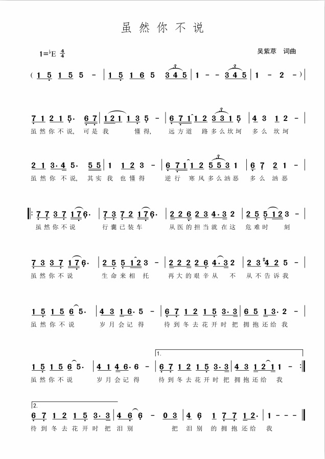 【作者创作故事】新冠疫情牵动着全国人民的心,而我也时刻关注着疫情发展,目睹了我们医务工作者在前线用生命英勇抗击疫情的感人事迹,特别是在我们的学生当中也有许多奋战在一线的医护人员,他们的这份责任感和使命感,让我非常感动,激发了我的创作灵感,于是有感而发创作了这首歌曲,也算是为这次的抗击疫情做出了一点力所能及的事情。这首歌的歌词和旋律属于抒情叙事风格,似乎娓娓道来一件事,音乐色彩很温暖,可以感受到凛冬即将过去,春暖花开之日不远了。我也希望这次疫情能够尽快过去。