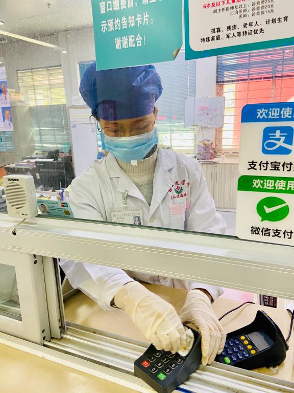 门诊挂号收费处作为财务科的一线窗口,第一时间启动防控疫情应急措施,上班的同事贴心将窗口要使用的密码键盘进行消毒,做到“一患一消”,充满爱的举动温暖着大家的心。