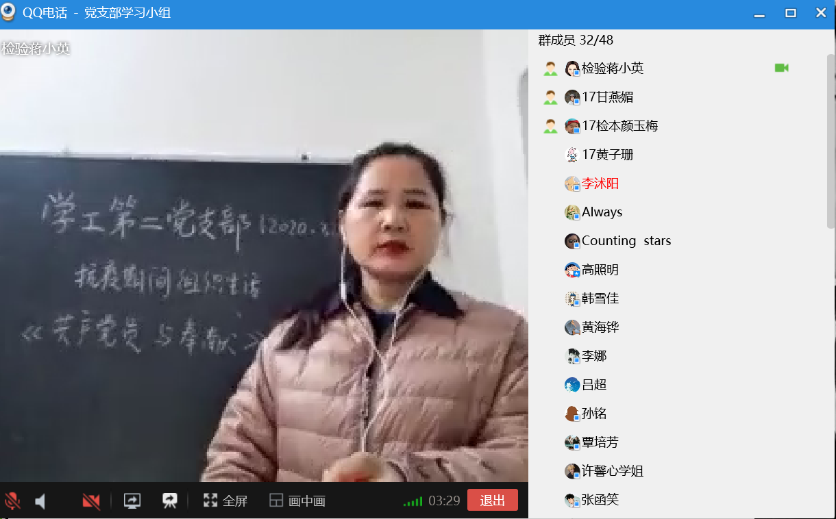 在全国抗疫的关键时期,雷锋月如期到来,为贯彻落实“向雷锋同志学习”的精神,弘扬并学习疫情期间不同岗位的工作人员的无私奉献、敬职敬业、攻坚克难的新时代雷锋精神,3月13日,医学检验学院学工第二党支部在线上开展主题为“共产党员与奉献”的党组织生活会议,会议由支部书记蒋小英老师主持,检验学工第二党支部全体党员、预备党员参加了会议。