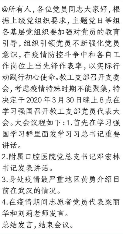 为有效应对新型冠状病毒肺炎疫情,切实发挥疫情防控工作中党支部的战斗堡垒作用和党员的先锋模范作用,3月30日晚8点,口腔医学院教工党支部利用“学习强国”学习平台会议系统召开党员大会。共计34名党员及入党积极分子参与此次会议。当天召开的线上会议由支部书记秦世玉同志主持,会议共四项议程。