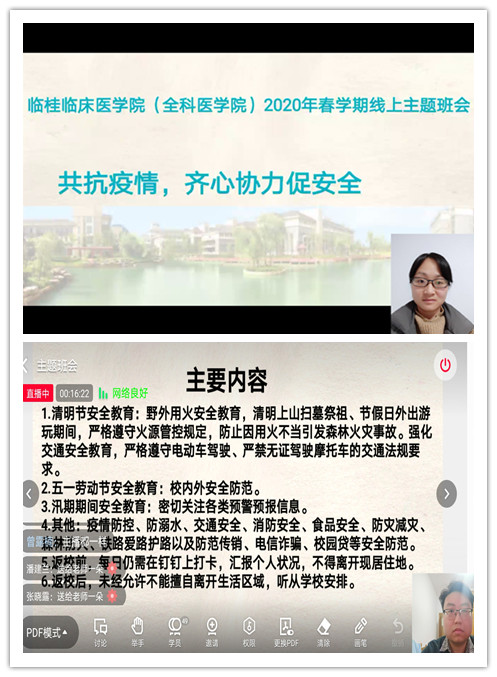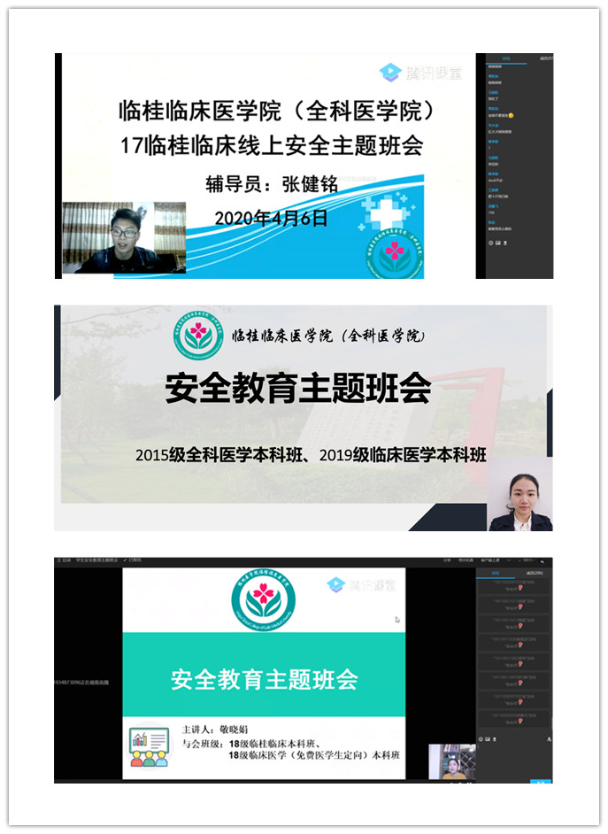 为进一步做好学校安全稳定工作,加强疫情防控工作,保障学生在校内外的安全,提高学生安全意识,防范安全隐患,临桂临床医学院(全科医学院)于2020年4月3日- 4月6日组织各班级开展线上安全教育主题班会活动。