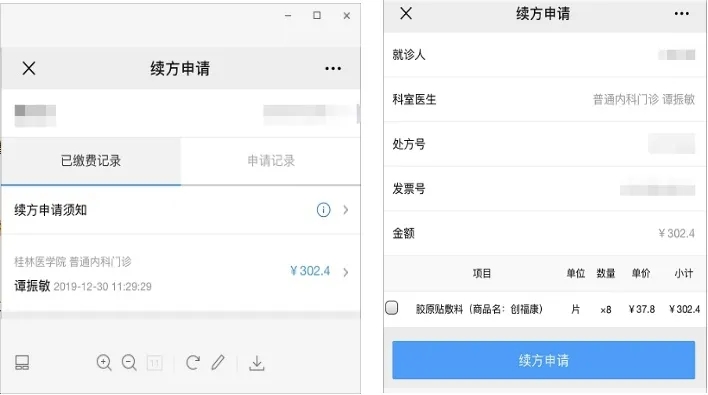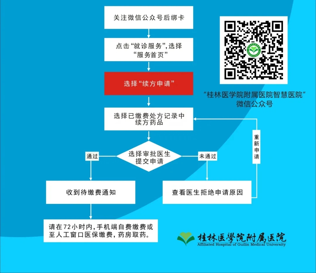 为保障慢性疾病患者规范治疗和用药的需求,桂林医学院附属医院微信公众号已推出线上“续方申请”功能。