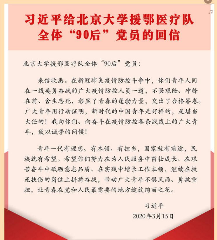 这是习近平总书记3月15日给北京大学援鄂医疗队全体“90后”党员的一封回信,也是给所有青年一代医护人员的一封回信。习近平总书记向他们致以诚挚的问候。谆谆嘱托,激励着新一代的年轻医生们勇挑重担,为打赢疫情防控阻击战贡献力量,让青春在党和人民最需要的地方绽放绚丽之花。